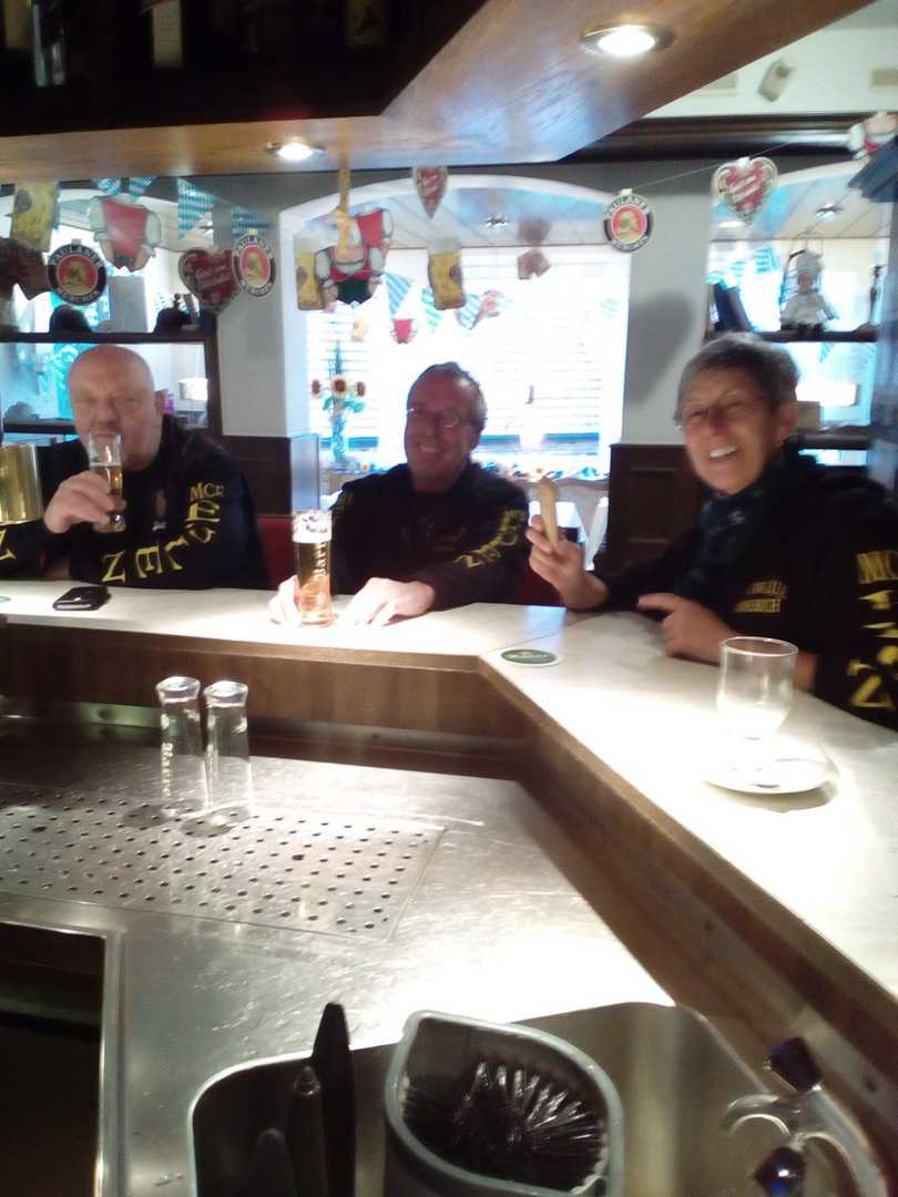 Hier angekommen wurden wir freundlich begrüßt, bezogen unsere Zimmer und nahmen erst einmal eine heiße Dusche. Danach begaben wir uns umgehend an die Hotelbar um ortsübliche Kaltgetränke zu uns zu nehmen (bei Gitte war anfänglich auch ein Tee oder Grog dabei). Nach einem deftigen und leckeren Abendessen bekamen wir an der Hotelbar Besuch von 2 Mitgliedern des Organisations-Komitees (Biker-Treffen NRW). Es wurde ein langer u. geselliger Abend.